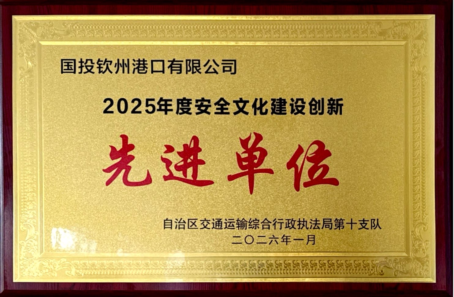 2026年1月,公司荣获钦州港2025年度安全文化建设创新先进单位